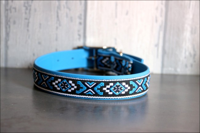 Collier biothane - 25MM de large - Bleu azur & aztèques - 38 à 46cmLes Bonnes Affaires !!!